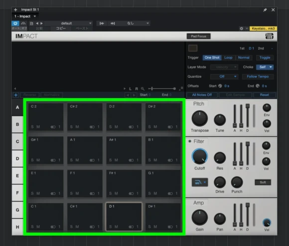 Impactが表示されました。この音源はMPCなどのファードウェアサンプラー的な使用感で操作ができるサンプラー音源です。緑のラインで囲まれた16個のパッドにひとつひとつの音源を割り振り、それを叩くことで音を鳴らすことができるものです。もちろんモニターを叩くわけにはいかないので、かわりにMIDIキーボードやMIDIパッドを使用します。各パッドにC1とかD#2などの表示がありますが、これがMIDIキーボードで対応するノート(音階)です。MIDIキーボードのC1を叩けば左下のC1のパッドを叩いたことになります。左下がドでそこから右へ半音ずつ上がっていきます。なお左端に縦にA〜Hのボタンがあり、現在はAが選択されています。これを例えばBに切り替えると今までとは別の16個のパッドを使用することができ、A〜Hで16×8で合計128個のパッドを使用することができるようになっています。