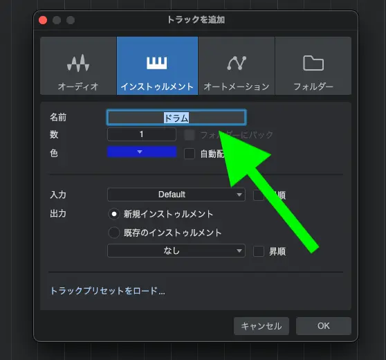 すると下のようなウィンドウが表示されるので一番上の項目で「インストゥルメント」を選択。ここではどのタイプのトラックを作成するかを設定する項目です。「インストゥルメント」はソフトウェア音源を使用するトラックです。そして「オーディオ」はオーディオインターフェースを通じて直接楽器やボーカル等を録音する時に使います(あとのPartで説明します)。オートメーションはオートメーションを記録するトラックですが、今の段階ではまだ使わなくていいと思います。名前の項目はわかりやすいものを設定しておきましょう。ここでは「ドラム」にしました。